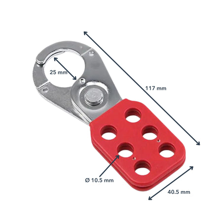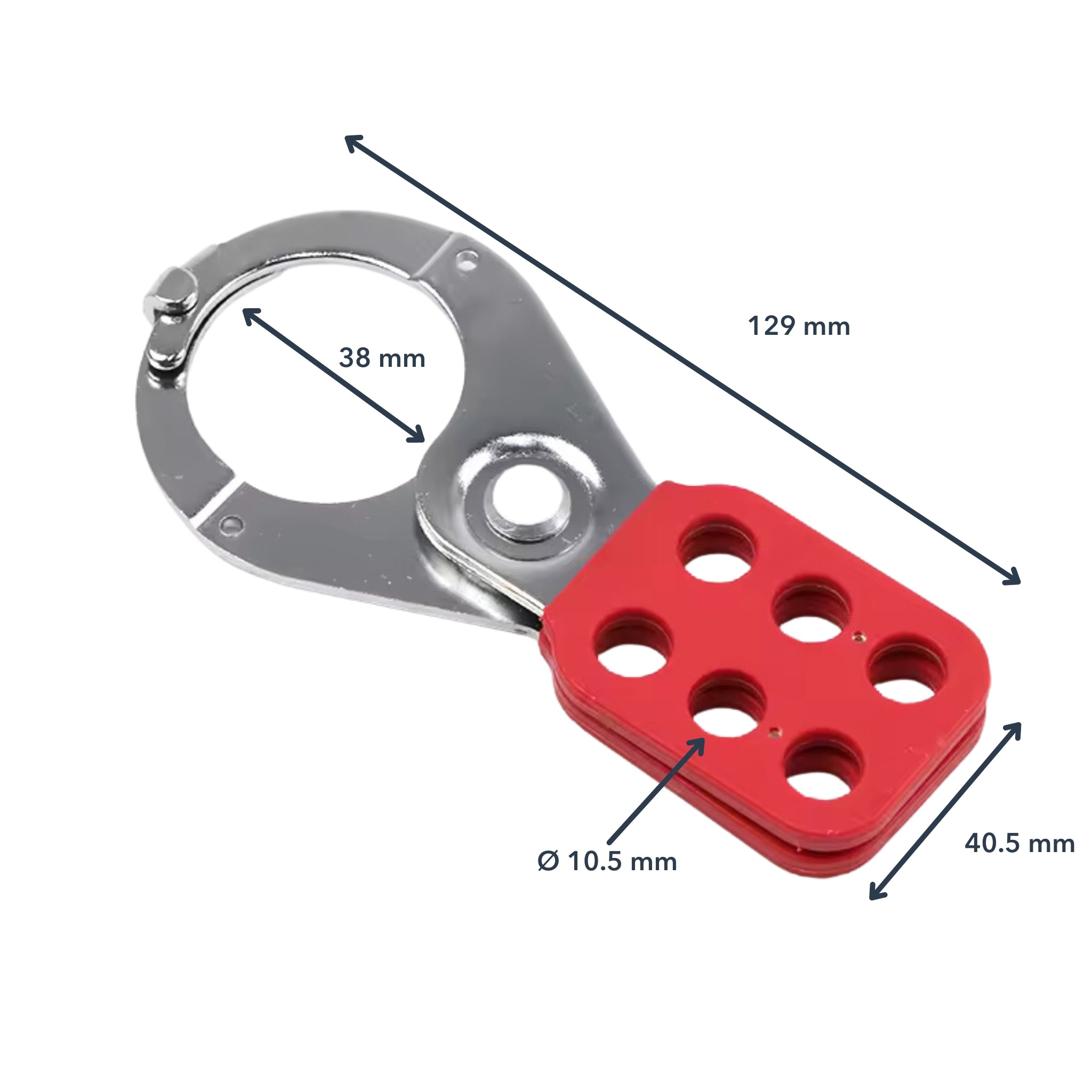 The Lockbox's 25/38mm steel hasp, designed specifically for applications where multiple locks are required at a single isolation point. Lock shackle made from nickle plated steel with a red plastic vinyl coated body.